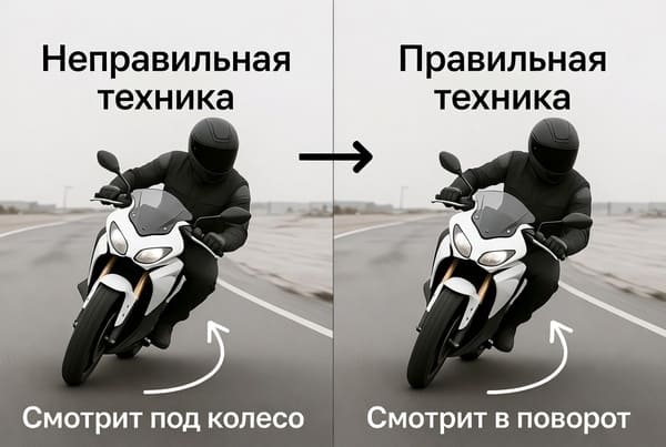Смотрит под колесо — мотоцикл «тянет» туда же. Решение: тренируйте «взгляд в поворот».